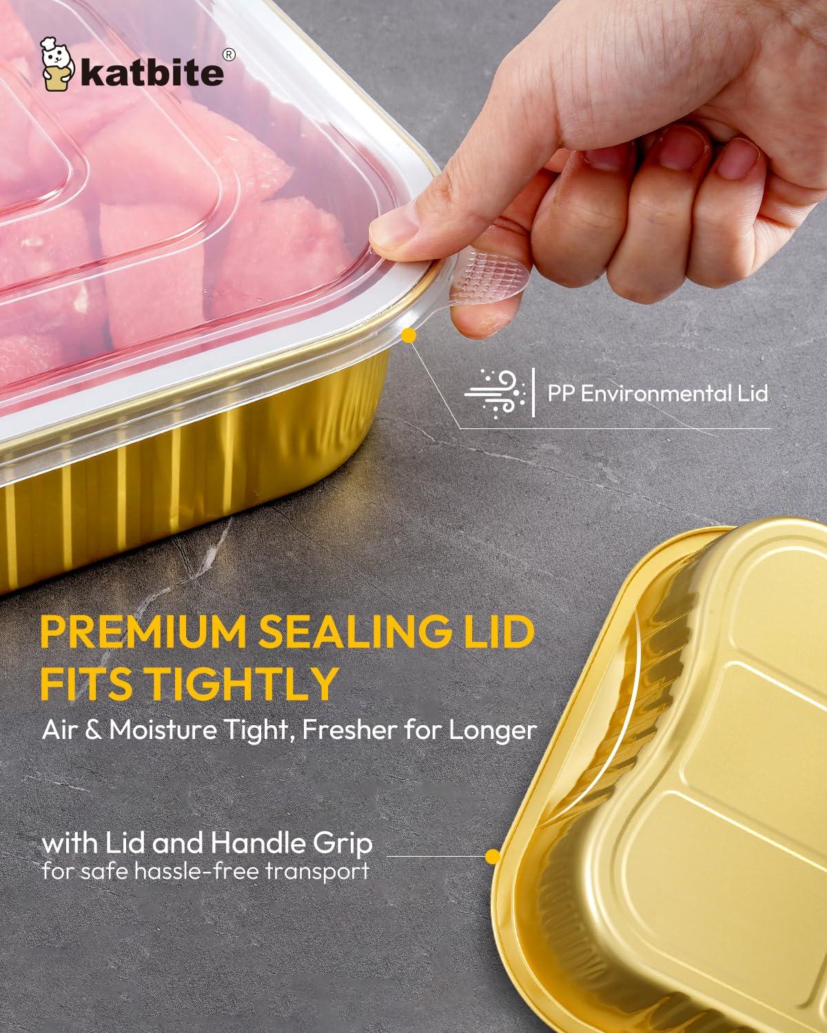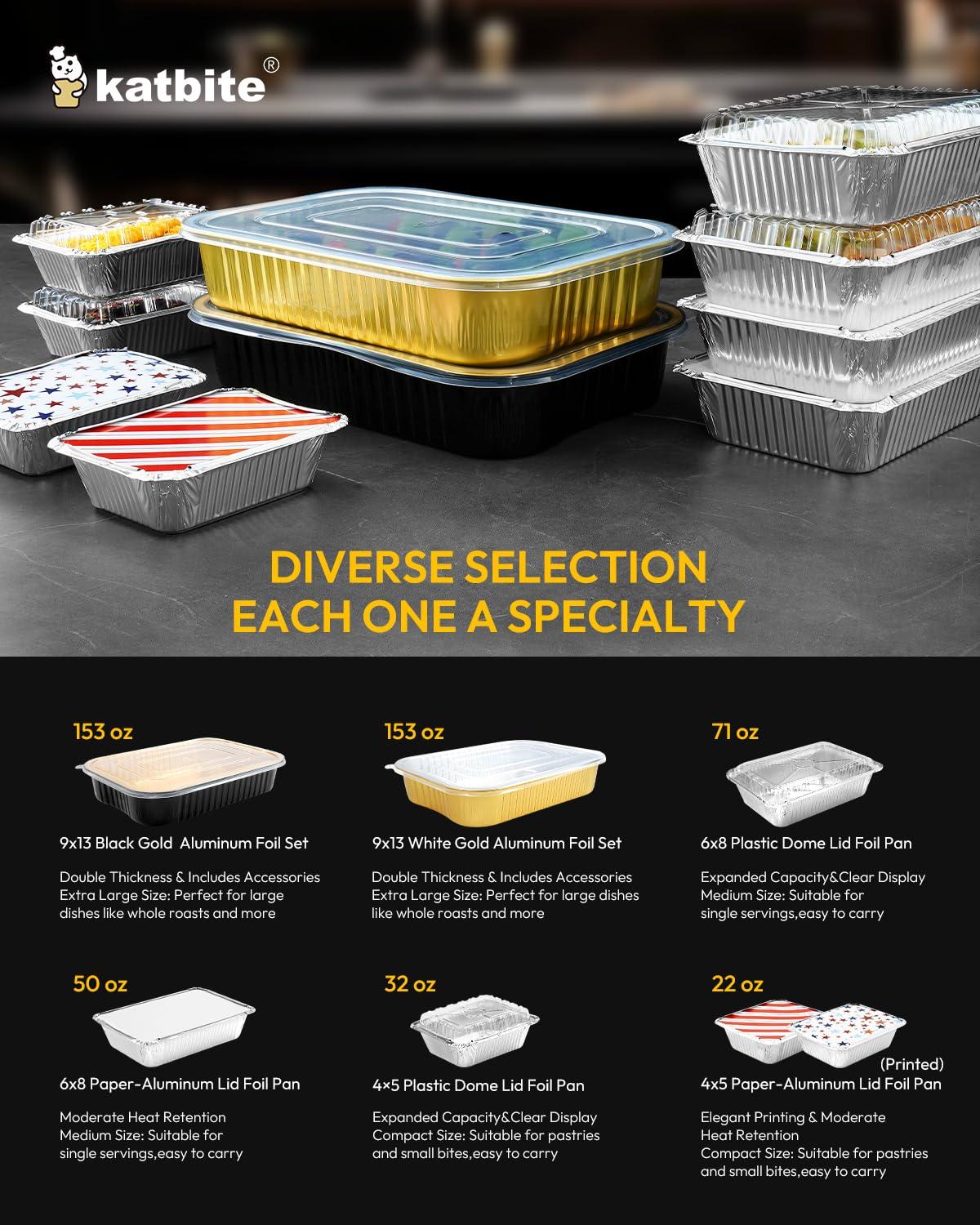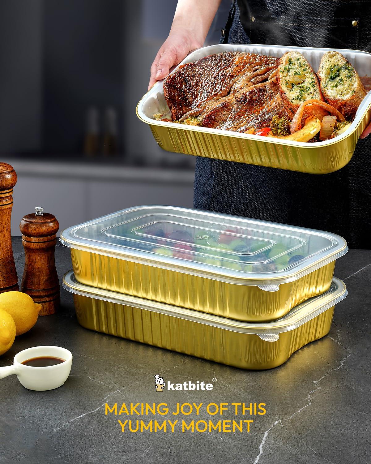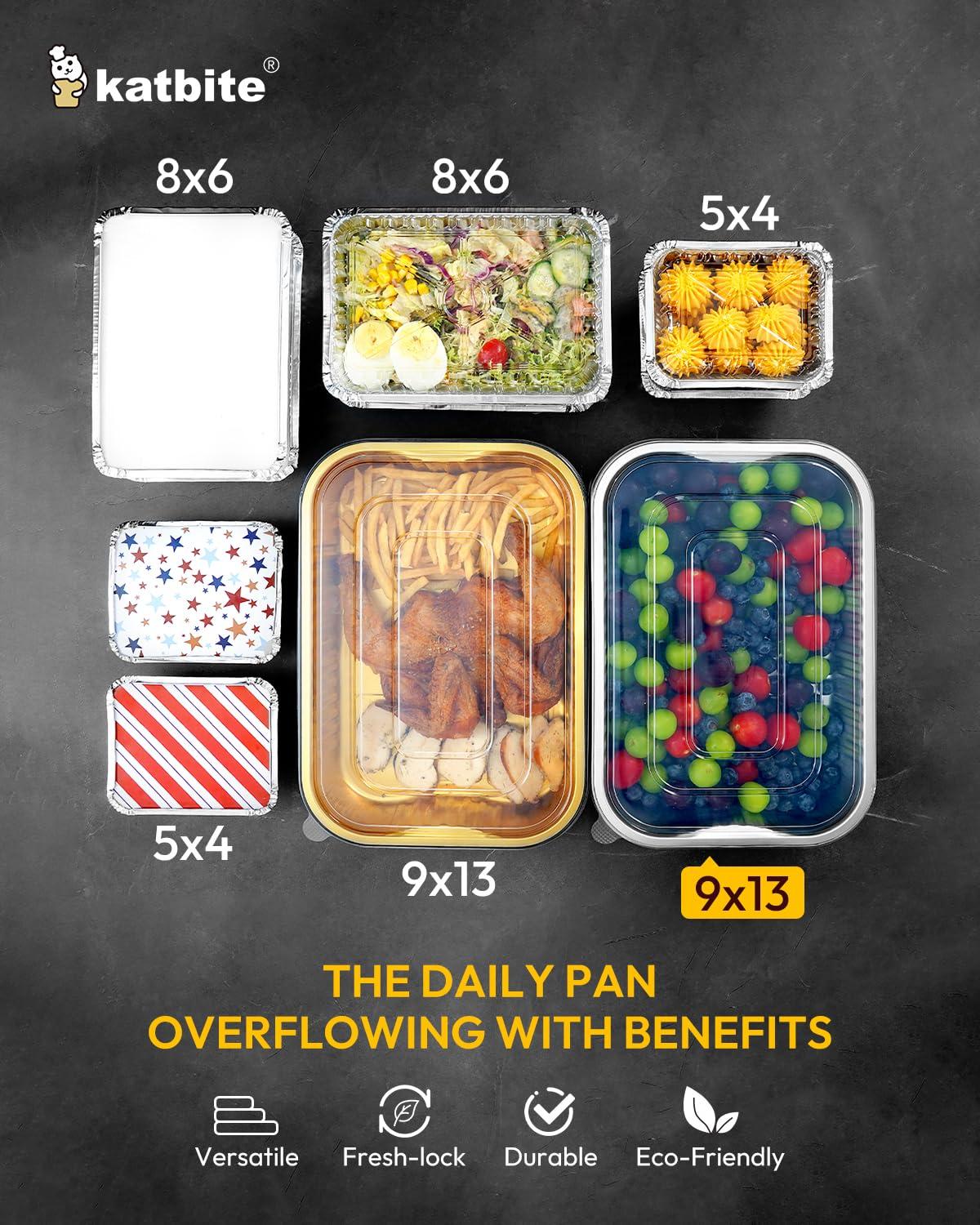 High-Quality Aluminum & Food-Grade Plastic Lids: Katbite aluminum foil pans are crafted from high-quality aluminum, boasting twice the hardness of standard foil pans. The aluminum pan's durability ensures long-lasting use, making it essential in any kitchen. The food-grade plastic lids ensure safety and are free from harmful substances, making these baking pans safe for use in dishwashers, refrigerators, open flames, etc. These premium aluminum pans guarantee safety and superior cooking results, providing peace of mind with every use.