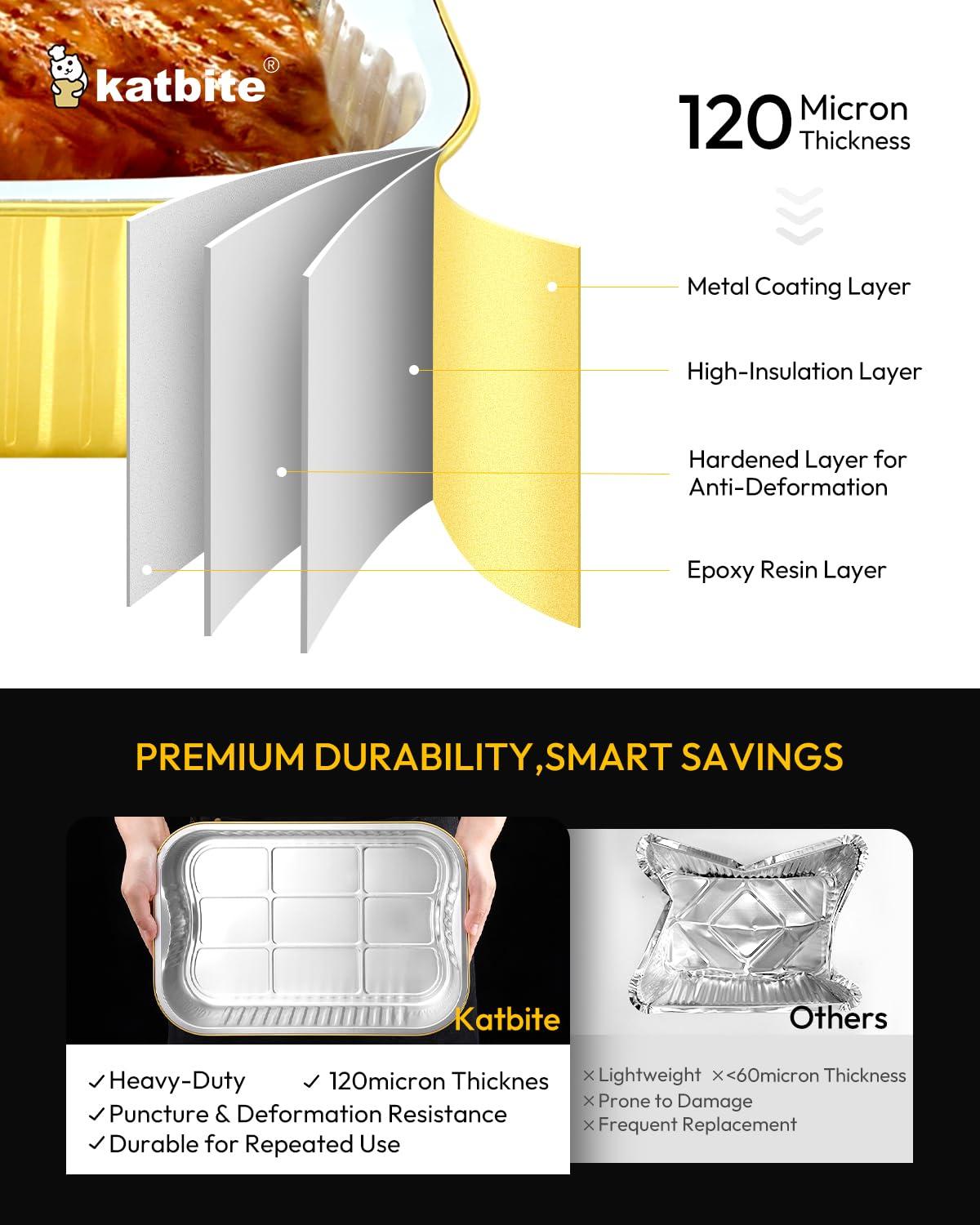 Large Capacity and Space-Saving Design: Katbite 9×13 baking pan offers a generous capacity of 4500ml, making it ideal for family dinners, commercial use in kitchens and catering events. The foil pan's stackable design saves space in your kitchen, ensuring an organized and efficient workspace. The double-layer, double-color design of the aluminum pan adds a touch of elegance. This combination of large capacity, space-saving design, and high-end appearance makes these foil pans a top choice for both professional and home chefs.