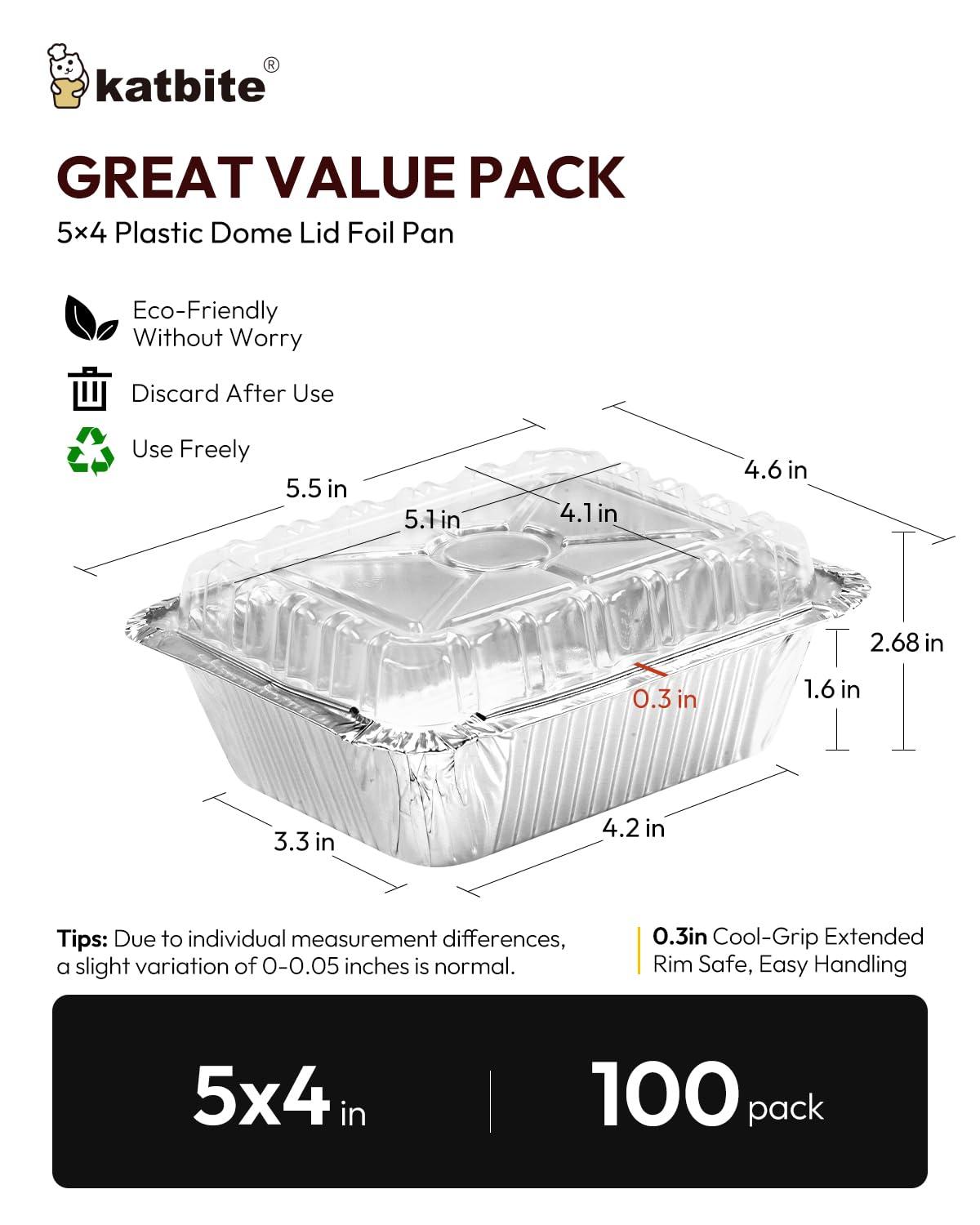 “Secure Storage with Clear Lids: Each Katbite 5 x 4″” 100-count aluminum pan includes a clear lid with closeable hemmed edges for a tight seal, ensuring secure food storage and easy content identification. These versatile aluminum pans replace heavy dishes, serving trays, cling film, plastic jars, and bags, simplifying cleanup—just recycle the foil pans! Ideal for households, kitchens, catering, take-outs, delis, schools, medical facilities, and cooking classes.Upgrade your kitchen with these essential aluminum foil pans today!”