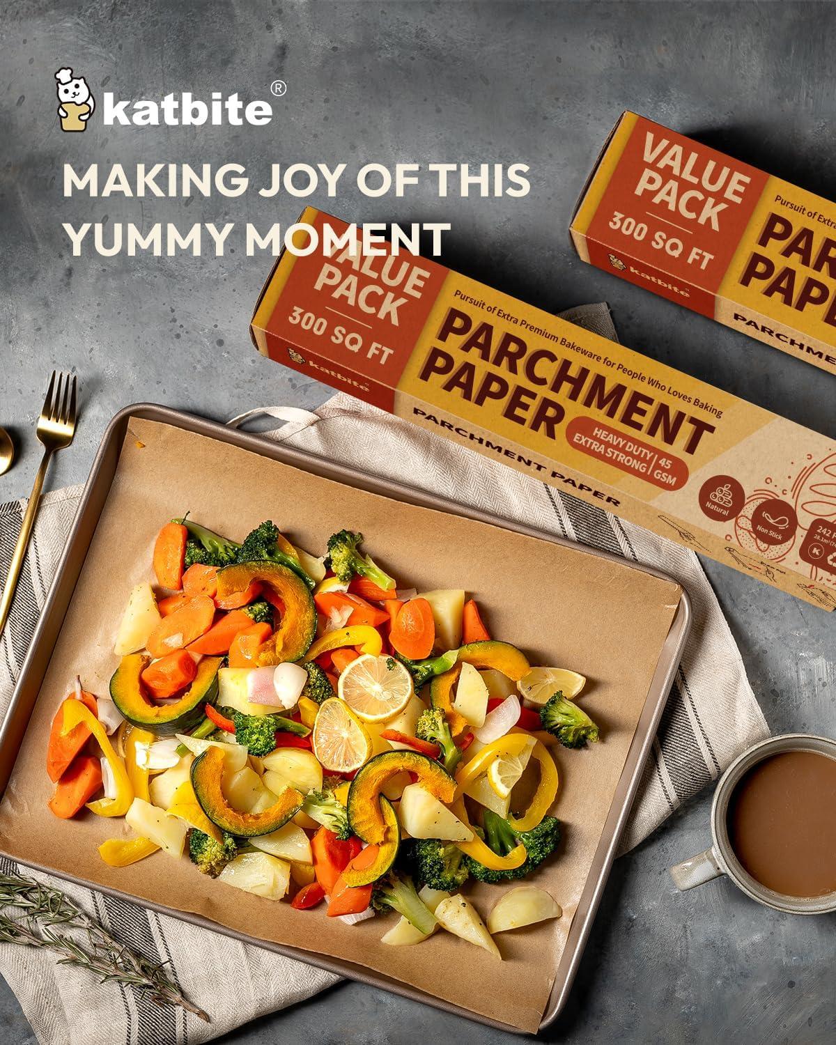 NON-STICK & EASY TO CLEAN: Do you love baking but hate cleaning up? This nonstick parchment paper sheet makes it possible and even works great! Food can be easily slide off from the baking tray and you just need to remove the baking paper and throw it away after baking. Even wet dough won't stick to it. Let Katbite be your good kitchen helper!