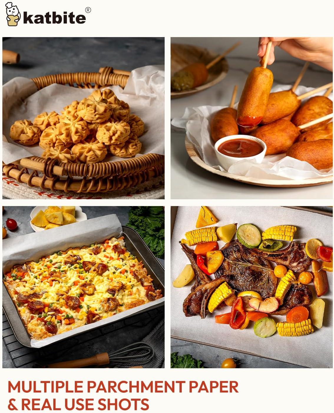 ADVANTAGES OF THE PRODUCT – Katbite baking parchment paper with 2-side food grade silicone coating, heavy duty 45gsm parchment paper, 12% thicker than others'. Greaseproof, waterproof, satisfy almost all your baking needs.