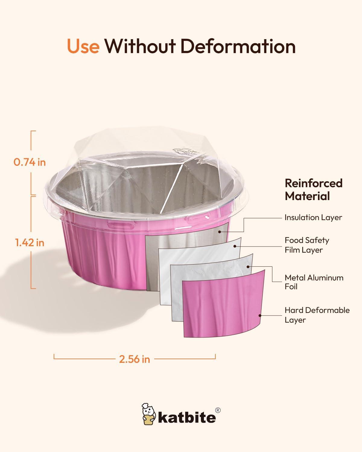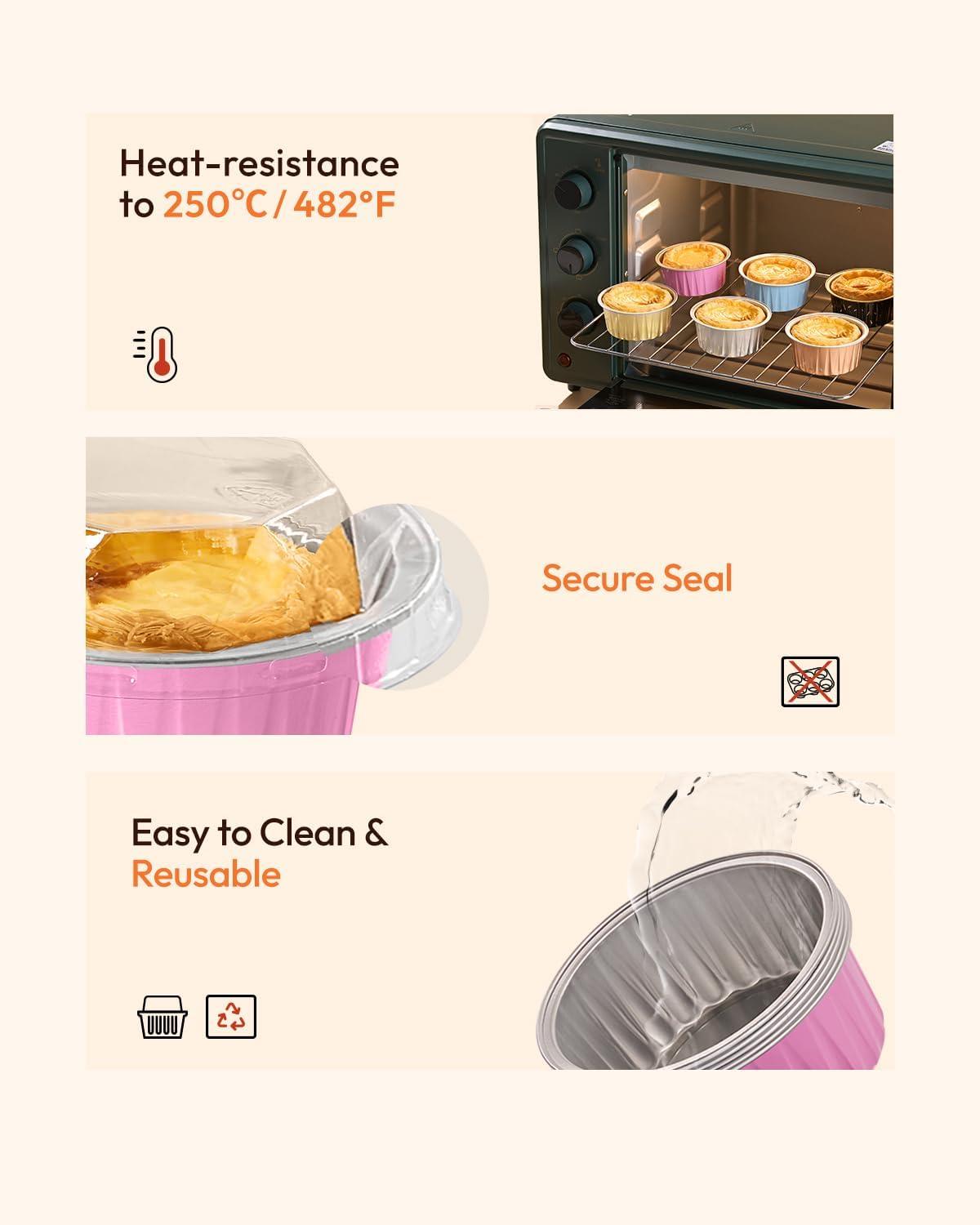 High-Quality Aluminum: Made with food-grade thick aluminum foil, the disposable ramekins with lids maintain good structural stability, allowing for direct oven baking, simplifying the baking process. Their smooth surface is water and oil resistant, enhancing the overall baking and serving experience.