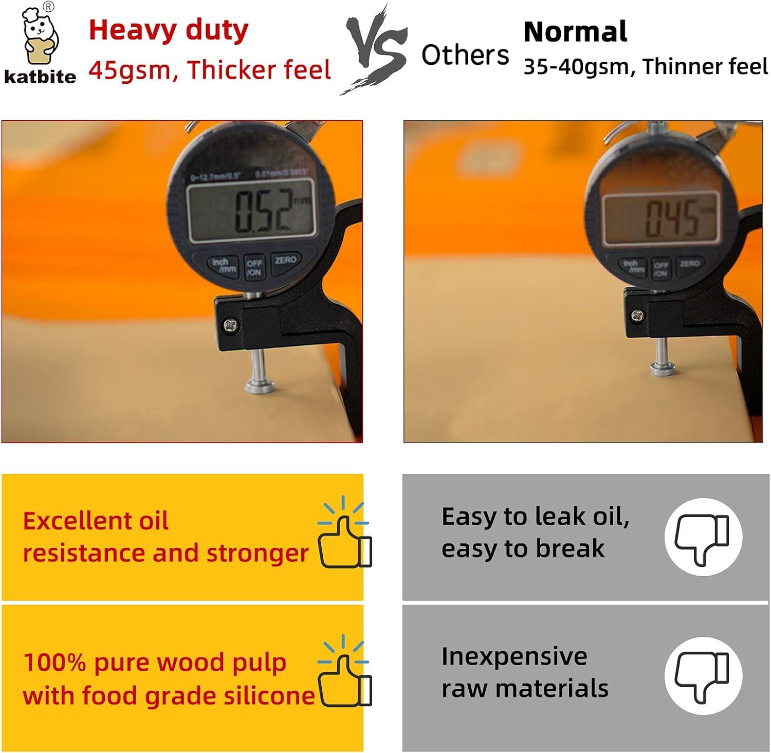 ADVANTAGES OF THE PRODUCT — Katbite baking parchment paper with 2-side food grade silicone coating, heavy duty 45gsm parchment paper, 12% thicker than others'. Greaseproof, waterproof, satisfy almost all your baking needs.