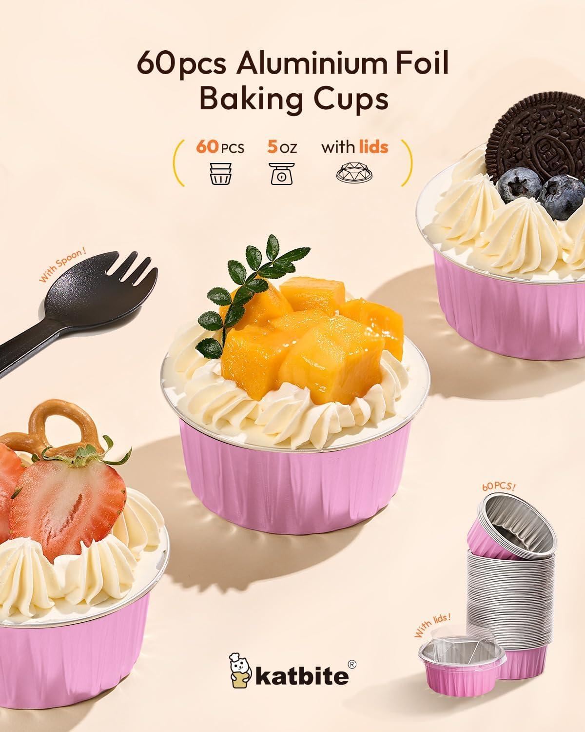 Value Pack disposable ramekins: This aluminum ramekins includes 60 5-ounce aluminum foil baking cups, accompanied by 60 matching clear lids and 60 individually wrapped spoons, providing a one-stop solution for your large gatherings or dessert preparations.