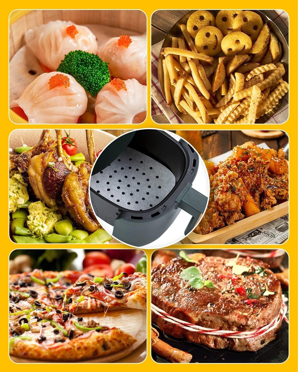 SAVE TIME & SAVE PROBLEM: Pre-cut square air frier cookers liners can save you a lot of baking time, and perforated parchment paper allows you to speed up the steam circulation through the air fryer or steamer and ensure that the food is heated evenly. Enjoy your meal!