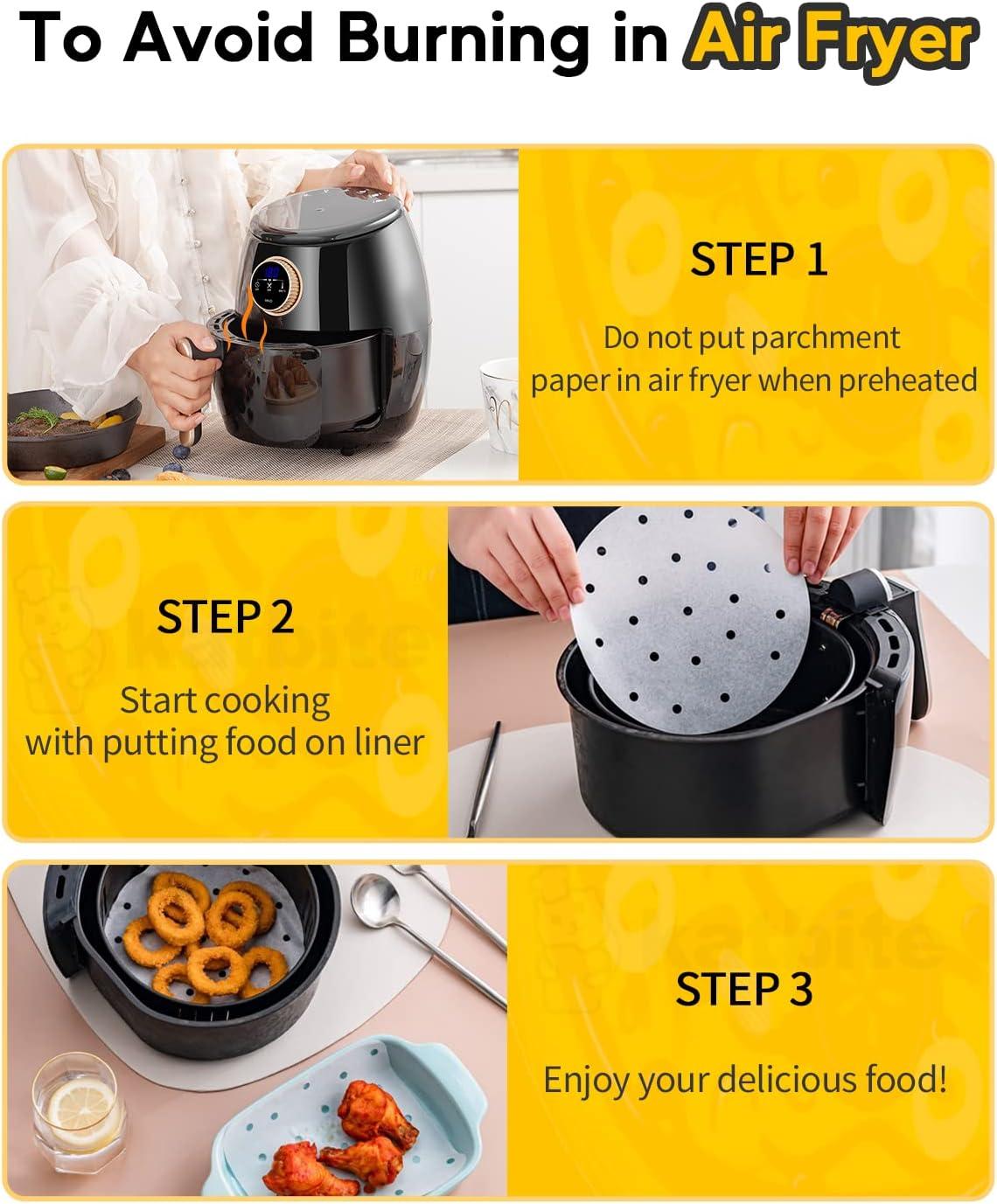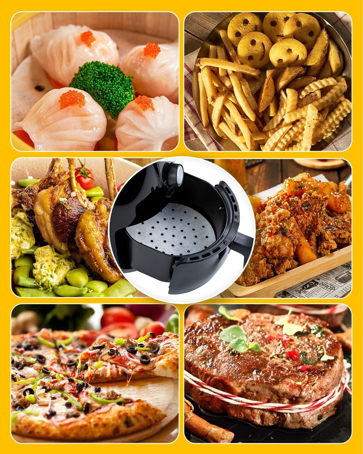 NATURAL & FOOD SAFETY: Air fryer parchment paper liners are made of pure wood pulp and fluorescent-free.Unbleached, Non-toxic, and Non-stick ensure food safety and taste and keep food complete appearances such as bread, chicken, and snacks.