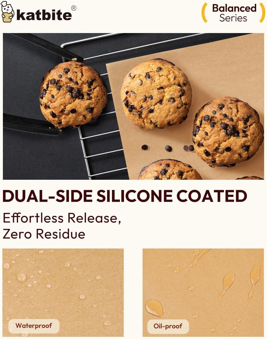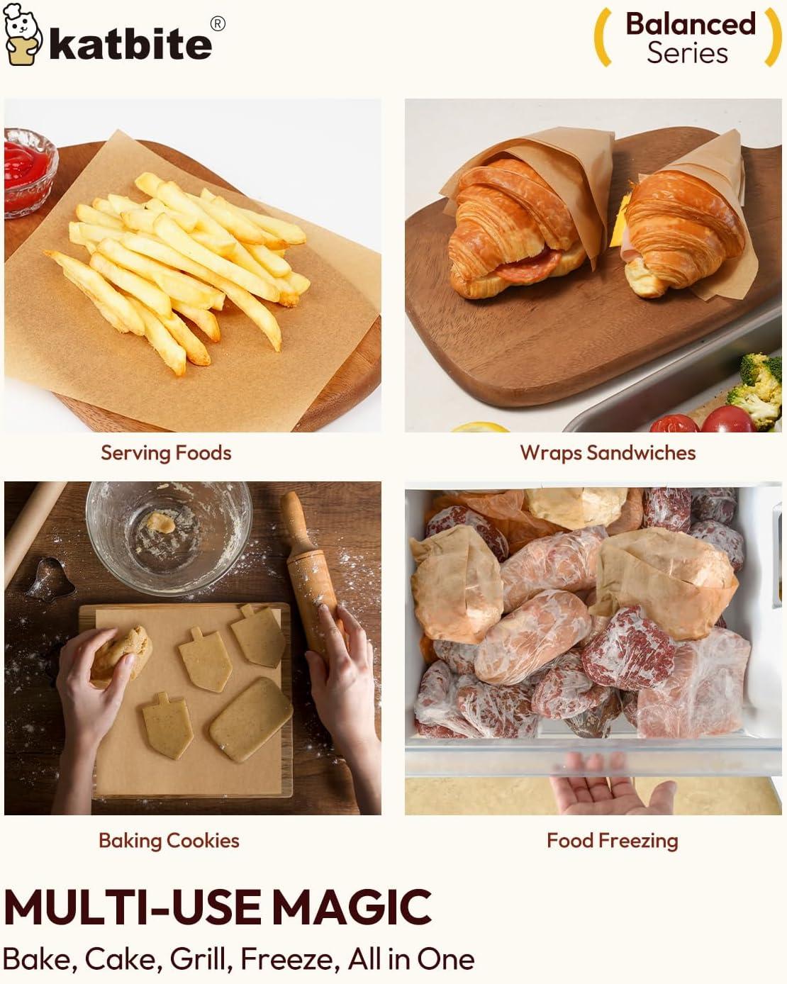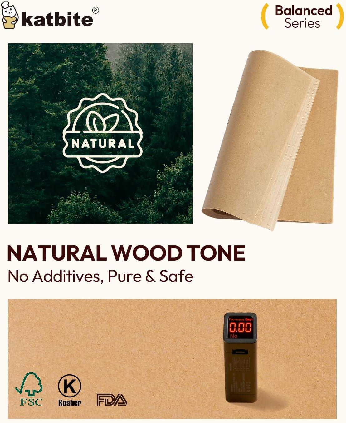 Healthy & Natural: Katbite parchment paper, part of the product, packaging and wrappings of paper are made with FSC-certified wood pulp, our unbleached and fluorescent-free parchment paper ensures reliability without any safety concerns. Featuring food-grade silicone coating on both sides, these sheets provide a safe, non-toxic baking surface.Trust Katbite Balanced Series for a healthy, natural, and sustainable baking experience.