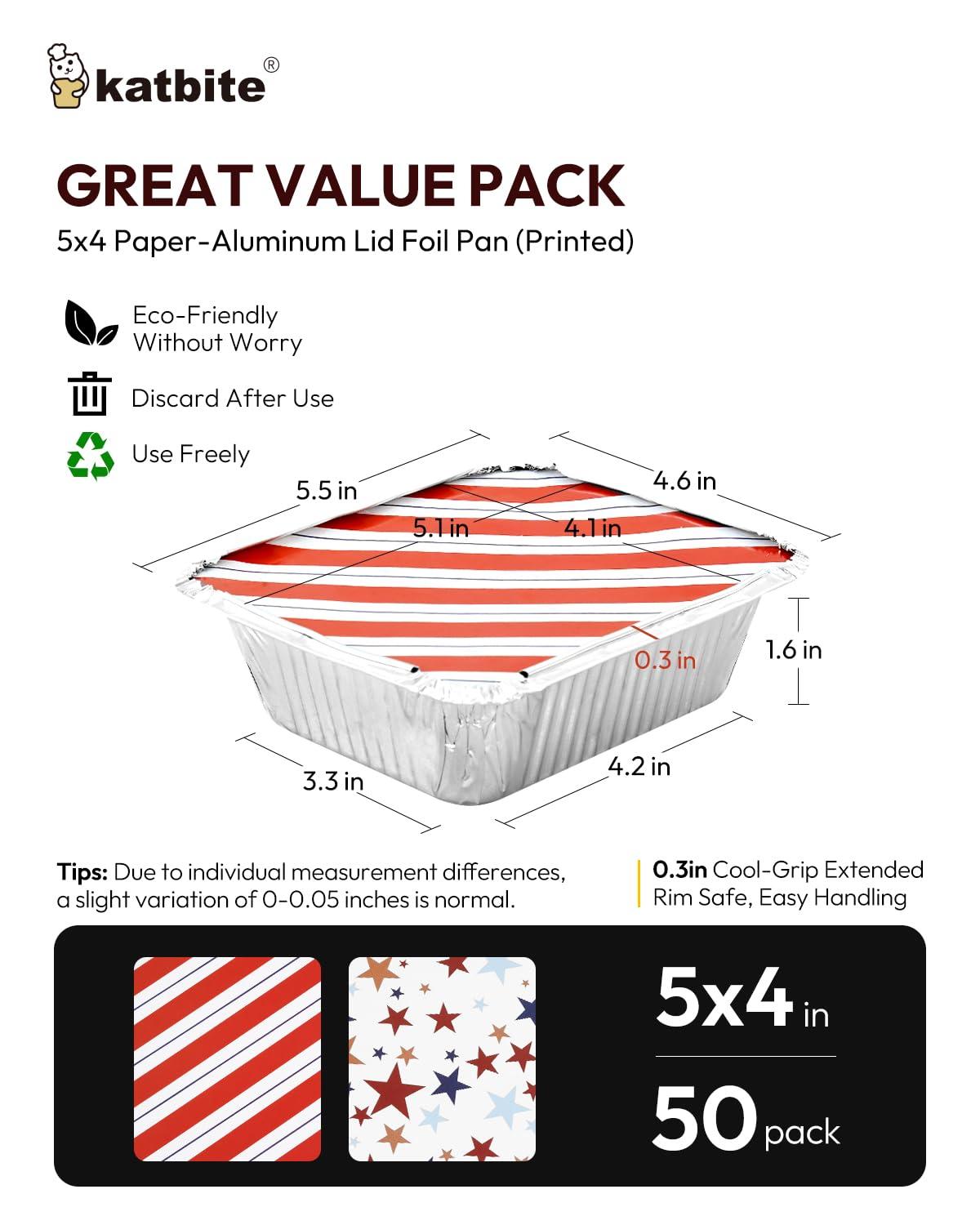 Value Pack Mini Aluminum Pans With Lids: Embrace sustainability with our 50-pack of 5×4 inch 1 lb/16 oz recyclable disposable small aluminum pans, including 50 paper lids. Each aluminum pans features a classic decorative cardboard lid that preserves food and adds a touch of life. The top length of each foil pans is 5.5 inches, the top width is 4.6 inches, and the depth is 1.6 inches. These sturdy, reliable aluminum pans with lids keep food fresh and intact while being fully recyclable, helping reduce your carbon footprint.