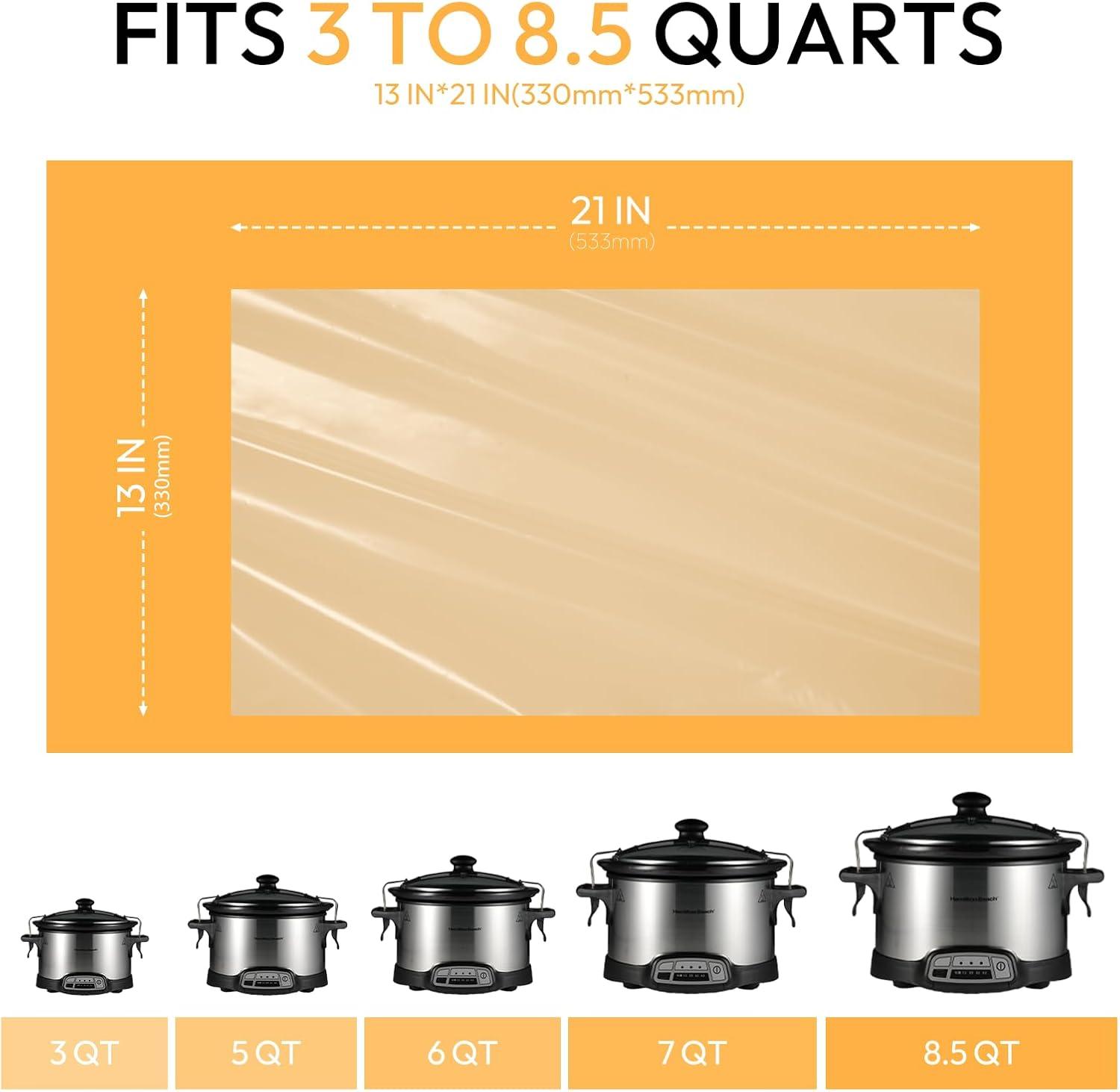 PERFECT FIT—50 disposable slow cooker (13″x21″) stretches to snugly hug all 3-8.5QT slow cookers—round, oval, or rectangular, like a second skin