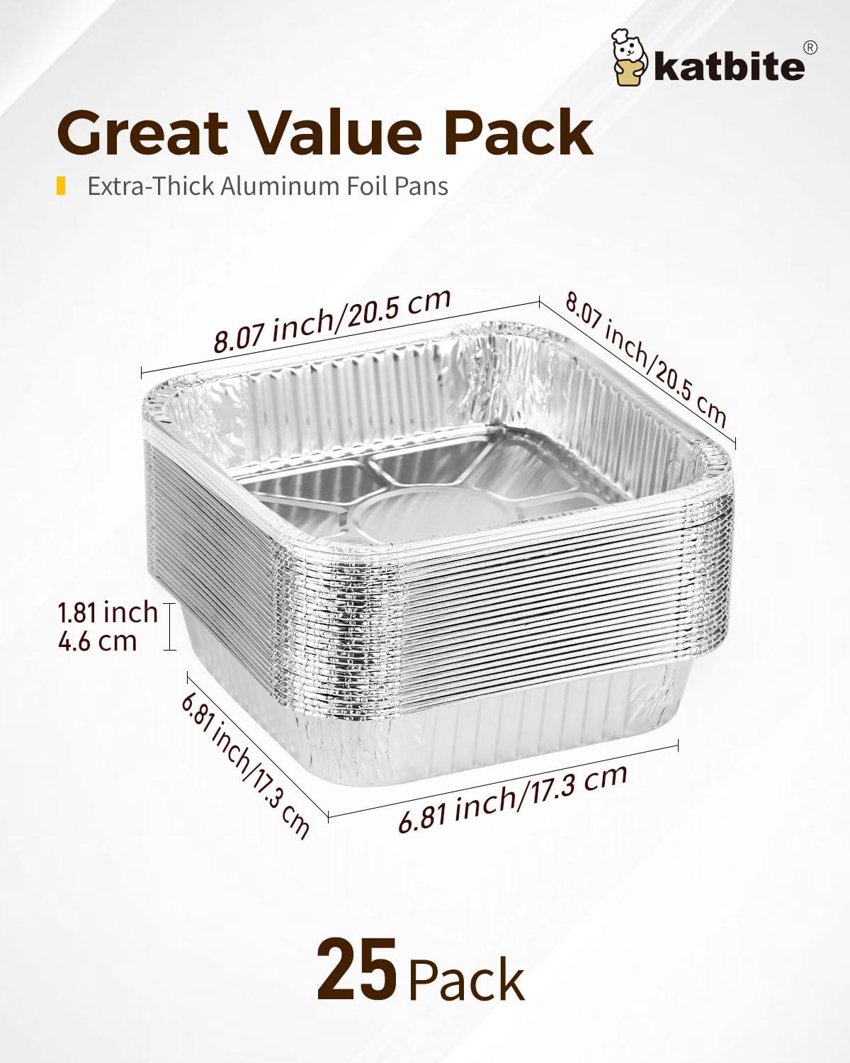 Great Value- 8×8 foil pans value pack comes with 25 aluminum foil pans. Measures: 8″ L x 8″ W x 1.69” H