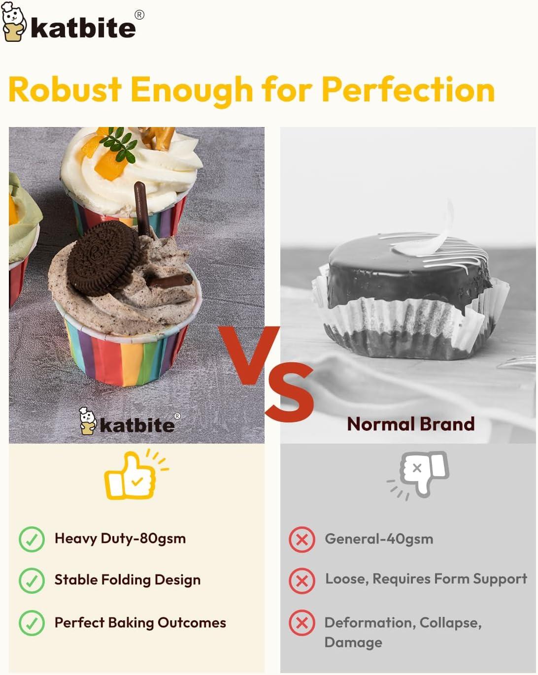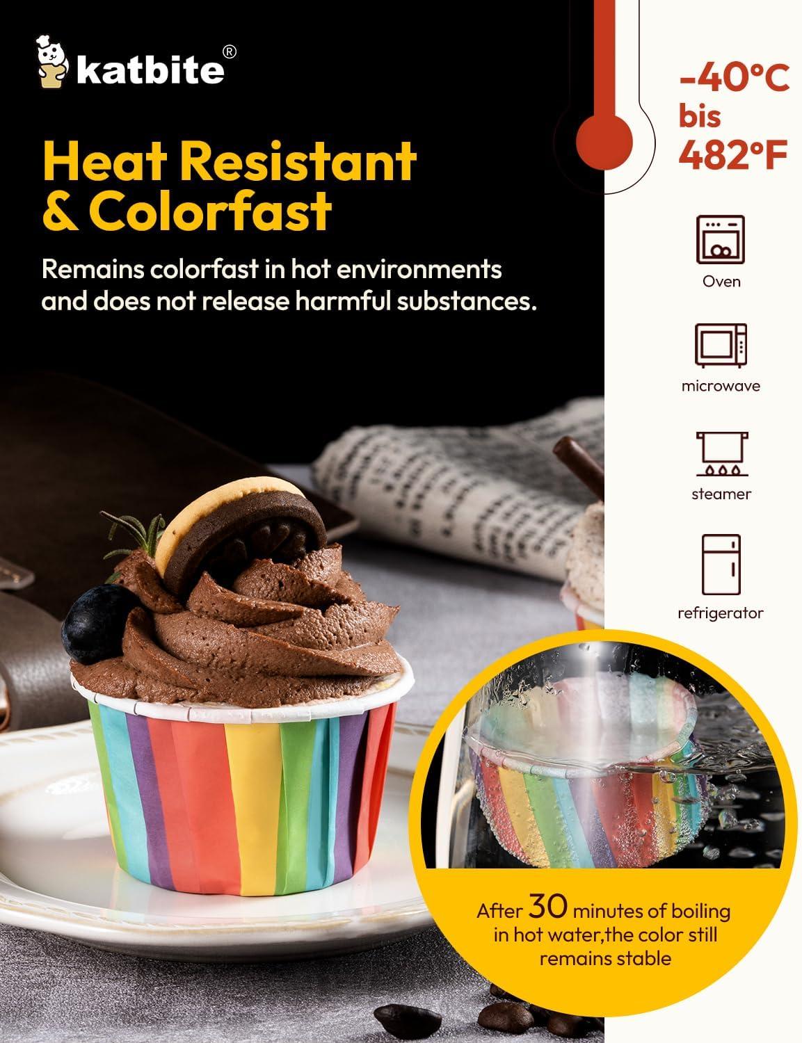 Safe to Use – Paper cupcake liners made of 100% pure wood pulp, no fluorescent agent. It will not fade after being boiled in water for half an hour, safe and non-toxic, feel free to use. Katbite greaseproof paper temperature resistance is from -40 to 482℉.Whether it's an oven, Microwave oven, steamer or refrigerator, you can use this muffin liners.